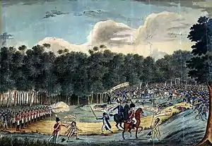 Los enfrentamientos entre los aborígenes y los europeos fueron localizados, ya que los primeros no formaban confederaciones capaces de ofrecer una resistencia sostenida. Como resultado no hubo una sola guerra, sino más bien una serie de compromisos violentos y masacres en todo el continente.[14] Organizada o desorganizada sin embargo, un patrón de guerra de fronteriza surgió con el comienzo de la resistencia aborigen en el siglo XVIII y ha continuado hasta el siglo XX. Esta guerra contradice lo popular y lo académico, a veces como un "mito" de la solución pacífica de Australia. Frente a los colonos la resistencia aborigen a menudo reacciona con violencia, resultando en una serie de masacres indiscriminadas. Entre las más famosas figura la batalla de Pinjarra en Australia Occidental en el año 1834. Pero estos incidentes no fueron sancionados oficialmente, y después de la masacre de Myall Creek en Nueva Gales del Sur en el año 1838, siete europeos fueron ahorcados por su participación en los asesinatos.[15] Sin embargo en Tasmania, en la llamada Guerra Negra, también conocida como Genocidio de Tasmania, que se libró entre el año 1828 y el año 1832, la intención era la de expulsar a la mayoría de los habitantes nativos de la isla a una serie de penínsulas aisladas. A pesar de que se inició con el fracaso de los británicos finalmente resultó con bajas considerables entre la población nativa y su rendición.[16][17]