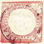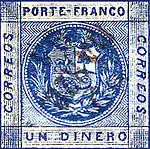 Entre 1862 y 1863, aparecieron dos sellos con el escudo peruano en relieve, en las denominaciones de «Un Dinero» (rojo) y «Una Peseta» (marrón). Este diseño está basado en los sellos británicos de 1, 6 y 10 peniques de 1847-1854, con la cabeza de la Reina Victoria del Reino Unido también en relieve.[2]
