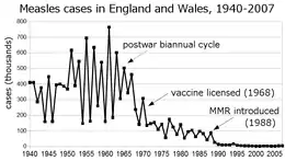En Londres, entre 1950 y 1968, había epidemias cada dos años, pero en Liverpool, que tenía una tasa de natalidad más alta, hubo un ciclo anual de epidemias. Durante la Gran Depresión en los Estados Unidos, antes de la Segunda Guerra Mundial, la tasa de natalidad era baja y las epidemias de sarampión eran esporádicas. Después de la guerra la tasa de natalidad aumentó y las epidemias se producían regularmente cada dos años. En los países en desarrollo con altas tasa de natalidad, las epidemias se producían cada año. [127] El sarampión sigue siendo un problema importante en países poco desarrollados con altas tasas de natalidad y carencia de campañas de vacunación eficaces. [129]