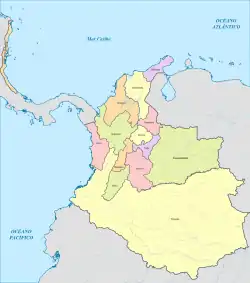 Colombia empezó a organizarse territorialmente como país entre 1811 y 1816 tras su independencia de España, periodo en el cual estuvo organizada en las Provincias Unidas de la Nueva Granada, Estado conformado por las provincias que hicieron parte del territorio central del Virreinato de la Nueva Granada, lo que anteriormente se denominaba Nuevo Reino de Granada (es decir, aquellas que no pertenecían a la Capitanía General de Venezuela y la Presidencia de Quito, las cuales conformaron sus propios autogobiernos en dicho periodo,[51] y a la Real Audiencia de Panamá, que permaneció fiel a la corona española).[52]