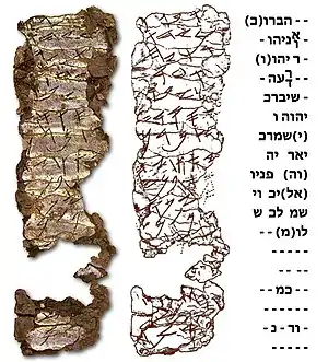 Los libros que comprenden la Biblia hebrea y el Antiguo Testamento (no exactamente iguales entre sí) están escritos en su mayor parte en hebreo bíblico y en algunos casos en arameo bíblico. Han llegado a la actualidad en distintas versiones, siendo las principales el texto masorético, los 47 libros de la Septuaginta (tradición al griego usada en el judaísmo por los judíos helenizados desde el siglo III a. C. hasta el siglo V d. C. y todavía usada en la cristiandad oriental) y el Pentateuco samaritano. Las diferencias entre esas tres tradiciones son útiles para la reconstrucción más ajustada del texto original y para trazar la historia intelectual de las distintas comunidades judías y cristianas. El fragmento más antiguo conservado es un pequeño amuleto de plata datado ca. 600 a. C., que contiene una versión de la bendición sacerdotal o bendición aaronita (ברכת כהנים, birkat kohanim):[14] "Que el Señor haga resplandecer su rostro sobre ti..."
