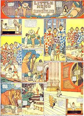 Winsor McCay, pionero en todo, muestra los dos lados de lo onírico, lo positivo y lo negativo, en dos series de principios del siglo pasado: El pequeño Nemo en el País de los Sueños (1905-1913) y Sueños de un fanático del pan tostado con queso (1904-15), respectivamente. Otras series de temática fantástica de esta época son The Upside Downs (1903) de Gustave Verbeek, organizada en páginas que componían la historia primero del derecho para continuarse del revés al invertir la página, y Kinder Kids y Wee Willis Winkies World (1906) del pintor, miembro fundador y profesor de la Escuela de la Bauhaus Lyonel Feininger en las que inauguraría el uso no-naturalista del color e incorporaría al cómic la antropomorfización de los personajes no humanos.