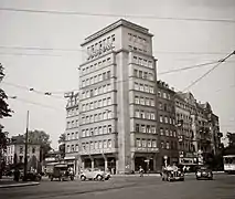 El primer usuario principal fue el Saxon State Bank, que tenía su sede en Dresde desde 1920. El inmueble fue completamente destruido durante los ataques aéreos de 1945 debido a sus grandes proporciones. Después de que el Landesbank liquidara el Saxon State Bank en 1948, la empresa de transporte siguió utilizando el edificio. El arquitecto Otto Ziller gestionó las reparaciones necesarias y la conversión para la mudanza de la empresa de transporte.