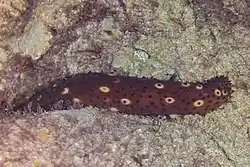 Se le llama comúnmente "pepino de mar con puntas oscuras" debido a la similitud que tiene este animal con un pepino y a tener siempre las papilas gustativas oscuras. El cuerpo es cilíndrico y en el dorso está cubierto de papilas cónicas dispuestas irregularmente. Esta especie se caracteriza por tener el cuerpo de color marrón, a menudo con manchas blancas redondeadas en la base de las papilas, pero siempre con papilas de color marrón oscuro. Alcanza unos 20 cm de longitud máxima. Cuando está amenazado, emite largos filamentos pegajosos de color blanco o rosa llamados tubos de Cuvier que están presentes en muchas especies pertenecientes a esta familia.