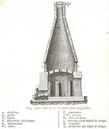 El horno de porcelana es un tipo de horno de reverbero vertical utilizado para cocer porcelana. Su interior está dividido por bóvedas planas en tres pisos, los dos inferiores con cuatro hogares dispuestos alrededor y calentados con leña. Cada piso tiene su puerta para introducir la carga y para la descarga de las piezas horneadas. En el piso superior, donde la temperatura es menos elevada porque no hay hogares se pone la porcelana cruda a bizcochar (primera cocción). En los otros dos, donde el fuego es más fuerte, se ponen las piezas a cocer con la cubierta.