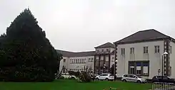 El edificio original del Hospital Gil Casares fue proyectado en 1928 como reformatorio de menores, promovido por la Junta de Protección de Menores,[13] dentro de parte de los terrenos de la antigua propiedad del Hospicio Vello, pero en 1938, cuando ya estaba construido, se cambió su función y fue inaugurado el 7 de junio con el nombre de Sanatorio Antituberculoso de La Choupana,[14] siendo su primer director el cirujano Manuel López Sendón, que llevaba ya más de un mes con el hospital en funcionamiento.[15][16][17] Contó en estos primeros tiempos con 110 camas (mitad para hombres y mitad para mujeres), de las que 100 iban a ser dedicadas a pacientes pobres, estando distribuidas en sanas con entre cuatro y doce camas.[18] El equipo lo conformaban dos médicos (el propio López Sendón y el doctor Galarza), cuatro enfermeras, dos practicantes, cinco religiosas y personal auxiliar. Contaba con quirófano, cuarto para curas, laboratorio, cuarto de reconocimiento, farmacia y rayos X. También contaba con viviendas para las enfermeras y las religiosas, capilla y despachos para lo director, el ayudante y el administrador.