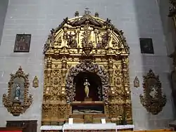 Todas las pinturas al fresco desaparecieron convertidas en escombro cuando se hizo la demolición de todo el conjunto del hospital. Sin embargo se salvaron el retablo y el Santo Sepulcro que todavía pueden verse en la iglesia vallisoletana de la Magdalena. Se había encargado en agosto de 1719 la arquitectura del retablo a Juan y Pedro de Correas —padre e hijo—, maestros tallistas y ensambladores, con un precio de 2000 reales. El retablo es bastante barroco y consta de un cuerpo central principal y dos laterales separados por estípites, elementos muy utilizados en el barroco novohispano; la hornacina central está rodeada por un marco riquísimo dispuesto en arquivoltas repletas de ángeles. En su origen fue todavía más voluminoso pero después se aligeró un poco para agrandar el hueco y dar espacio a la imagen que se colocó del Cristo del Perdón. Después se cambió por una imagen de la Magdalena penitente que es la que pervive todavía en el año 2017.[26]