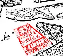 El traslado de la Corte a Valladolid en el reinado de Felipe III, desde 1601 a 1606, supuso un cambio en la vida de sus ciudadanos y en el desarrollo urbano y socialde la nueva capital. En torno a la Corte llegaron personajes famosos o de categoría o simplemente hombres de la administración que con el tiempo y por otras circunstancias consiguieron una gran relevancia. Tal es el caso de Miguel de Cervantes que llegó a Valladolid a mediados de 1603 reclamado por el Consejo de Hacienda para rendir cuentas ante la Contaduría General.[14] Cervantes y su numerosa familia se acomodarían a su llegada en alguna casa de la que no se tiene constancia hasta que el constructor Juan de las Navas edificó en agosto de 1604 unas casas en la zona del Rastro Nuevo de los Carneros, cercanas a la orilla izquierda del Esgueva y a pocos metros del hospital de la Resurrección. Cervantes alquiló una de esas casas y en ella vivió hasta pocos meses después del regreso de la Corte a Madrid.[15]