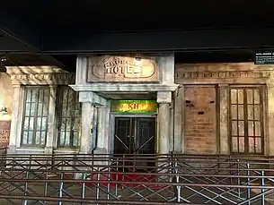 Entrada a la atracción"El espectáculo se desarrolla en un espacio muy poco iluminado. No encender mecheros ni cerillas. Ni fotografías, ni vídeos ni cualquier tipo de aparato electrónico. Y por supuesto, por favor, nunca fumar. Vayan siempre todos juntos, sin separarse, sin correr, sin pararse y nunca retrocedan por favor. No toquen a nada ni a nadie y les aseguro que nada ni nadie les tocará a ustedes... probablemente. Bienvenidos al Hotel Krüeger, si me acompañan les llevo a recepción."