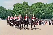 La Household Division tiene su cuartel general en Horse Guards desde 1750, ubicación también del Household Cavalry Museum. Desde 1758, cuando las obras de restauración llevadas a cabo por el arquitecto William Kent, la entrada principal de Horse Guards en Whitehall es el escenario del cambio de la guardia a diario.[1] Cuando la reina está en Londres, la guardia ceremonial, la Long Guard, se compone de un oficial, un cabo mayor que porta el estandarte, dos suboficiales, una corneta y 10 troopers. Cuando no está, la Short Guard la compone dos suboficiales y 10 troopers.[3]