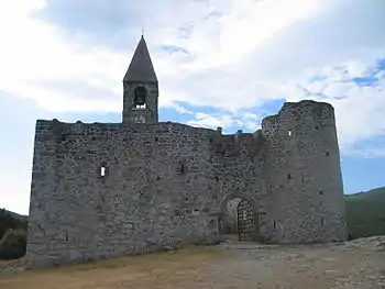 La iglesia románica, construida en torno a los siglos XII y XIII está rodedada por una muralla que sirvió de protección ante las incursiones turcas durante los siglos XV y XVI. El exterior, muy sencillo, no tiene adornos arquitectónicos ni escultóricos, la verdadera riqueza está en el interior. El edificio está orientado hacia el sureste, la entrada y el campanario al noroeste.¹