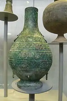 El hu es un recipiente en forma de pera que se ha encontrado tanto en forma redonda como cuadrada.[16] Se han descubierto ejemplos con una variedad de motivos decorativos. Durante la dinastía Shang, normalmente se ofrecía un hu, decorado con diseños de taotie relativamente simples. Los patrones de dragones, ganado y truenos también aparecen en vasijas hu durante la dinastía Shang. Durante la dinastía Zhou, el estilo de la vasija cambió, y el taotie fue reemplazado por "figuras en relieve pesadas y redondeadas sobre un terreno llano". Sin embargo, un ejemplo del período Zhou tardío muestra todo el recipiente cubierto con imágenes que se corresponden con la vida cotidiana. El cultivo de gusanos de seda, la caza, el tiro con arco y los motivos bélicos están representados.[17] Los motivos de dragones entrelazados también fueron populares durante el período Zhou,[18] igual que los diseños de ondas.[19] A finales del periodo de primaveras y otoños, la decoración de las vasijas en algunas regiones había cambiado para reflejar la influencia del arte de estilo animal de los nómadas de Asia Central. Los hu de este tipo solían utilizar diseños que eran versiones geométricas de los motivos anteriores de taotie y empleaba incrustaciones de cobre. Durante el Período de los Reinos Combatientes, la forma de la vasija se modificó ocasionalmente, adquiriendo una apariencia más cuadrada. Esta versión cuadrada de un hu se conoce como fāng hú. Otra variación fue el yu, que agregó un solo asa que se arquea sobre la tapa del recipiente.