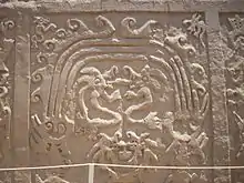 Los muros de las plataformas están decorados con bellos altorrelieves. Una figura adopta la forma de un arcoíris en forma muy estilizada en pos de engullir a un personaje, con cada cabeza.Al centro figuras antropomórficas en forma de Dragón con las fauces abiertas comparten el bocado. Una figura bicéfala posada sobre una pequeña plataforma o altar comparte entre sus fauces un tumi.