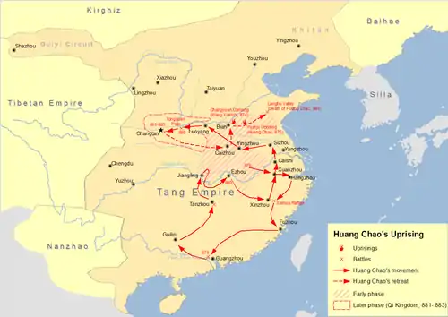 Posteriormente, Huang Chao recorrió con su ejército todo el centro de China, y su campaña lo llevó a muchos enfrentamientos con las fuerzas Tang: