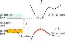 Una estructura de banda electrónica de un semiconductor (derecha) incluye la relación de dispersión de cada banda, es decir, la energía de un electrón E como una función del vector de onda del electrón k. La "banda sin relleno" es la banda de conducción del semiconductor; está curvada hacia arriba indicando masa efectivapositiva. La "banda llena" es la banda de valencia del semiconductor; se curva hacia abajo indicando masa efectiva negativa.
