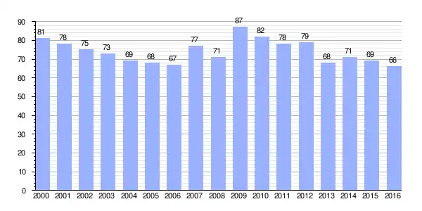 Gráfica de evolución demográfica de Huergas de Babia[3] entre 2000 y 2016 |