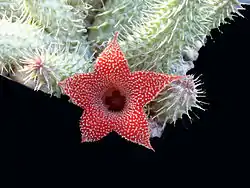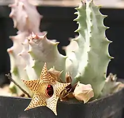 Es una planta suculenta con ángulos espinosos. Las flores son cinco lobuladas de color rojo, amarillo o marrón. Está relacionada estrechamente con el género Stapelia.