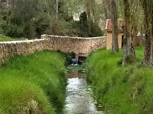 El agua se obtiene de dos fuentes manantiales llamadas Fresnera y Redonda, y es llevado por acequias (llamadas caceras) que transportan el agua por su inercia hasta las huertas a través de ramificaciones de menor entidad.[17]
