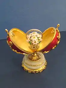 Tampoco tiene una procedencia claramente documentada o registro de propiedad. [4] Aunque sus materiales (oro, diamantes, esmalte, etc.) son típicos del taller de Fabergé, el método de construcción y la historia inadecuada/incompleta arrojan serias dudas sobre su autenticidad.g