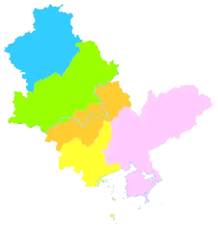Huizhou se divide en 5 localidades que se administran en 2 distritos y 2 condados.
