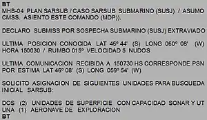 El 16 de noviembre de 2017 en la tarde, el diario digital Infobae publicó una noticia sobre «un submarino argentino perdido a la altura de Puerto Madryn» el día anterior.[4] El periódico publicó una foto de la comunicación interna de la Armada ordenando la búsqueda del submarino por «sospecha» de «extravío (SUBMISS)», informando última posición y hora conocida, y solicitando dos naves y una aeronave para iniciar el protocolo SARSUB de búsqueda y rescate (SAR = search and rescue).[4]