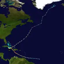 Después de pasar sobre el sureste de las Bahamas a principios del 9 de octubre, Flora comenzó a fortalecerse y el 10 de octubre volvió a alcanzar el estado de huracán mientras se encontraba a 290 millas (470 km) al sur de las Bermudas. El huracán se debilitó gradualmente a medida que avanzaba hacia el noreste y se debilitó a un huracán de categoría 1 el 11 de octubre. Flora perdió gradualmente su convección sobre el Océano Atlántico norte y pasó a ser un ciclón extratropical el 12 de octubre mientras se encontraba a 270 millas (430 km) al este. al sureste de Cape Race, Terranova. El remanente extratropical se disipó al día siguiente.[2]
