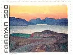 ![]() Vista de Hvítanes desde el Skálafjørður. Pintura de Sámal Joensen-Mikines en un sello postal.