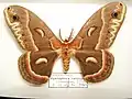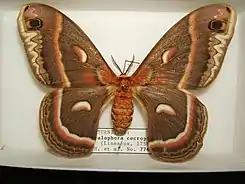 ![]() Ejemplar de hembra adulta de Hyalophora cecropia, en un exhibidor | ||