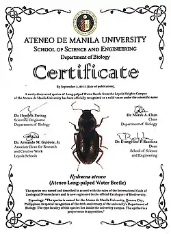 ![]() Certificado que representa la etimología de Hydraena ateneo | ||