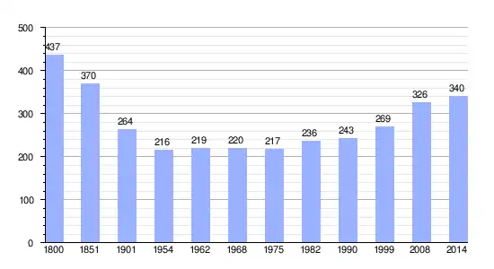 Los datos demográficos contemplados en este gráfico de la comuna de Hyenville[4]se han cogido de 1800 a 1999 de la página francesa EHESS/Cassini, y los demás datos de la página del INSEE.[5]