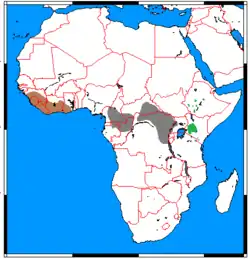 ![]() Área de distribución de: H. m. ivoriensis H. m. rimator H. m. meinertzhageni | ||