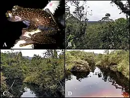 Su dorso es marrón oscuro con motas y manchas anaranjadas. El vientre es marrón grisáceo. Mide entre 6 y 7 cm.[2] Tiene una especie de garra en el pulgar, cuya función se desconoce pero que se cree que podría ser usada en luchas entre machos y como protección ante sus depredadores.[3] Está gravemente amenazada de extinción principalmente por la pérdida de hábitat causada por la minería ilegal.[2]