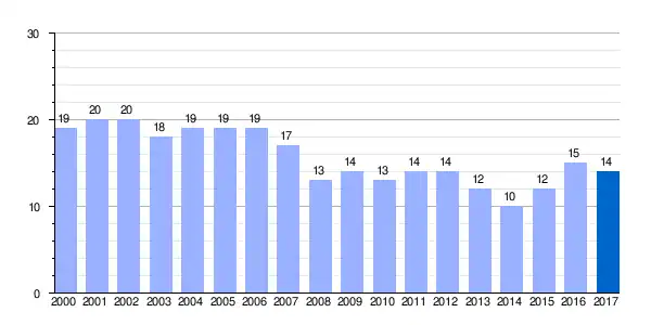 Gráfica de evolución demográfica de Ibarguren[1] entre 2000 y 2017 |