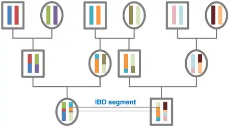 Todos los individuos en una población finita están relacionados si se remontan el tiempo suficiente y, por lo tanto, compartirán segmentos de sus genomas IBD. Durante la meiosis, los segmentos de IBD se dividen por recombinación. Por lo tanto, la longitud esperada de un segmento de IBD depende del número de generaciones desde el ancestro común más reciente en el locus del segmento. La longitud de los segmentos de IBD que resultan de un ancestro común n generaciones en el pasado (por lo tanto, involucrando 2n meiosis) se distribuye exponencialmente con la media 1/(2n) Morgans (M).[1] El número esperado de segmentos de EII disminuye con el número de generaciones desde el ancestro común en este lugar. Para un segmento de ADN específico, la probabilidad de ser EII disminuye a 2−2n, ya que en cada meiosis la probabilidad de transmitir este segmento es 1/2.[2]