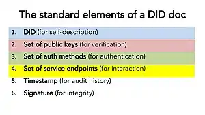 Los IDD son un tipo de identificador que permite una identidad digital verificable y descentralizada. [1] Se basan en el paradigma de auto-identidad soberana. Un IDD identifica cualquier sujeto (por ejemplo, una persona, organización, cosa, modelo de datos, entidad abstracta, etc.) que el controlador del IDD decida que identifique. Estos están diseñados para permitir que quien administre un IDD pueda demostrar su control, así como también implementar su uso independientemente de cualquier registro centralizado, proveedor de identidad o autoridad certificadora. Los IDD son URIs que asocian un IDD de sujeto con un IDD de documento, lo que permite interacciones confiables asociadas con ese sujeto. Cada IDD de documento puede expresar material criptográfico, métodos de verificación o puntos de servicio, que proporcionan un conjunto de mecanismos que permiten que un controlador IDD demuestre su control. Los puntos de servicio permiten interacciones confiables asociadas con el IDD de sujeto. Un IDD de documento puede contener semántica sobre el tema que identifica. Un IDD documento puede contener el propio IDD sujeto (por ejemplo, un modelo de datos). [3] [2]