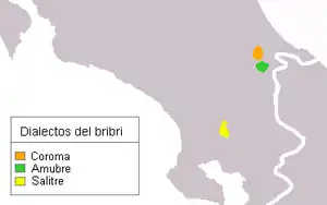 El bribri consta de tres dialectos bien definidos. Adolfo Constenla Umaña suele llamarlos dialectos del este, del oeste y del pacífico, sin embargo, en este artículo, se ha preferido la nomenclatura de Jara: de Coroma, de Amubre y de Salitre.