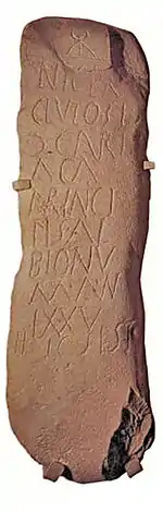 - Lenición de *m el grupo *-mnV- > -unV-:[37][38] ARIOUNIS MINCOSEGAECIS, formas de dativo de *ar-yo-uno- *menekko-seg-āk-yo- 'A las [deidades] de los campos de muchos cultivos' < pre-celta *ar-yo-mno-.[39]