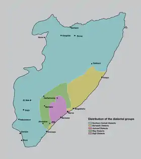 Saeed (1999) dividió los dialectos en tres grupos principales: norteño, benaadir y maay. El somalí norteño también se conoce como somalí común o estándar. El dialecto benaadir también se conoce como somalí costero (se habla en la costa de Banaadir, desde Cadale hasta sur de Baraawe, incluyendo Mogadiscio) y en las zonas no costeras próximaso. Los dialectos costeros tienen fonemas adicionales que no existen en el somalí común.