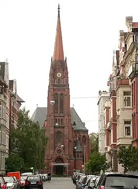 En los años 1880 a 1883, un representante de la escuela de construcción de Hanóver del siglo XIX, el alumno conejo Christoph Hehl, construyó un edificio de la iglesia en el estilo neogótico. Debido a la ubicación especial de la iglesia en el lado oeste de Bödekerstrasse, la torre con la entrada principal obtuvo su lugar en el este y el presbiterio obtuvo su lugar en el oeste de la iglesia. Sobre la entrada principal hay una representación tallada en piedra arenisca por Carl Dopmeyer. El retablo de la iglesia y el capitán Julius von Alten donaron el retablo romántico "Cristo en el mar" de Bernhard Plockhorst.