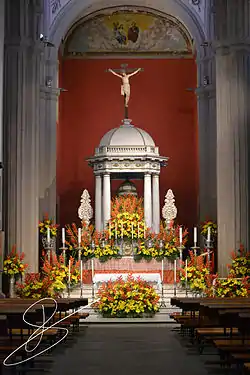 • El tabernáculo de la capilla mayor es sacramental, alejada la idea barroca del retablo y sobre todo del camarín donde exhibir la imagen titular, por tanto siguiendo conceptos más ilustrados. Se sitúa debajo de la cúpula.