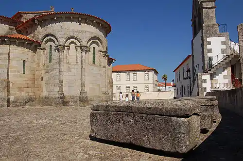 El acceso al templo se hace por el imponente portal axial de cinco arquivoltas y arcos de vuelta perfecta, insertado en la fachada ligeramente asimétrica y contrafortada, en el que destaca la decoración escultórica de los capiteles, y sobre todo del tímpano. El conjunto escultórico de este templo es de los más significativos del románico portugués. Vinculada a Cluny a través del monasterio de La Charité-sur-Loire, su programa iconográfico es muy ambicioso.