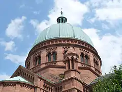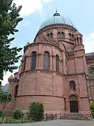 La iglesia, de arenisca rosa y roja, fue construida entre 1889 y 1893 por los arquitectos Skjold Neckelmann y August Hartel (también diseñadores del vecio palacio de Justicia, hecho de piedra caliza gris). Proyectaron la iglesia en un estilo que mezclaba el neorrománico y el neobizantino y la coronaron con una cúpula, la cúpula mayor de Alsacia (con una altura interior de 50 m y un diámetro interior máximo de 18,5 m).[2] Es uno de los grandes logros arquitectónicos de la Neustadt realizado en el momento de la anexión de Alsacia-Lorena.