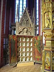 Hasta alrededor de 1400, la figura de María en el candelabro estaba en el nicho central de este altar. La figura de madera fue reemplazada por una gran custodia y varias imágenes sagradas. Además en el santuar se guardaban reliquias y monstruos. Todos ello se perdió durante la Guerra de los Treinta Años. Alrededor de 1350 se agregó la fila inferior, que representa a los apóstoles y a los dos santos patronos, san Sebastián y el papa Fabián. La fila superior en el ala izquierda muestra a Juan el Bautista, el anuncio de María, el nacimiento y la dedicación de Cristo. En el ala derecha, al azote de Jesús, a Jesús cargando la cruz, la Crucifixión y la Resurrección. La fila central en el ala izquierda muestra a Eva, a Sara, la puerta cerrada, la zarza ardiente y la dedicación de Samuel. En el ala derecha, aparecen Moisés golpeando la roca, el sufrimiento de Job, Abraham ofreciendo a Isaac, la serpiente de hierro, Samon y las puertas de la ciudad de Gaza. La fila inferior del ala izquierda muestra a San Fabián, y a los apóstoles Bartolomé, Tomás, Simón, Mateo, Andrés y Pedro. El ala derecha muestra a los apóstoles Pablo, Santiago el mayor, al evangelista Juan, a Felipe, a Judas el galileo, a Mateo y a san Sebastián.