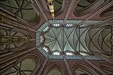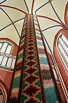 Las coloridas pinturas de azulejos de la columna central en el crucero norte (una similar en el crucero sur), fueron creadas en el siglo XIV basándose en diseños orientales. La columna central, los arcos en el crucero, las vigas debajo de los techos abovedados y las columnas laterales estabilizan el edificio de la iglesia que se construyó en una zona pantanosa. Al otro lado la lápida de la duquesa Ana de Mecklemburgo (fallecida en 1464), hija de Enrique IV de Mecklemburgo y hermana de Magnus II.