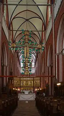 El altar transversal de doble cara y el pronaos, más alto que un hombre, dividían los bancos de los monjes, en la parte oriental, de los asientos de los hermanos laicos, en la parte occidental. El altar probablemente fue creado bajo la supervisión de un maestro de obras de Bohemia, o de Alemania del sur, con la ayuda del maestro del norte de Alemania, Bertram von Minden. Fechado en 1360-1370, es el más monumental de su tipo en Europa. En el momento de la dedicación de la iglesia en 1368, la mayor parte probablemente estaba terminada.