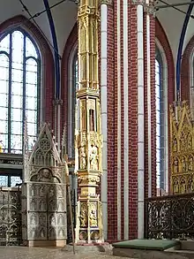 En el interior del arco de la galería del órgano se conservan valiosas pinturas murales que muestran enredaderas y el sufrimiento de Jesús, fechadas en el siglo XV. En el pilar del coro hay dos estatuas, una del duque Balthasar (fallecido en 1507) y la otra del duque Erich (fallecido en 1508). Ambos datan del período de transición entre el gótico y el renacimiento. Esos son epitafios de la más alta calidad.