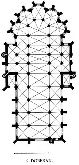 ![]() Planta de la iglesia (de Georg Dehio/Gustav von Bezold, Kirchliche Baukunst des Abendlandes. Stuttgart: Verlag der Cotta'schen Buchhandlung 1887-1901, Placa n.º 455). | ||