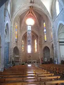 La iglesia es de nave única correspondiendo el primer tramo a la nave románica y el resto a la nave gótica. La cubierta de la nave románica es a doble vertiente de madera sobre arcos perpiaños, mientras que la cubierta en la nave gótica es de crucería con bóvedas nervadas.