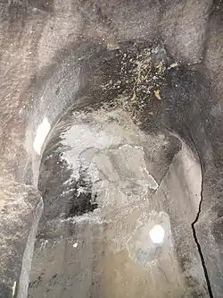 Interior de la iglesia rupestre de Arroyuelos, con arco de herradura, típico de la arquitectura mozárabe.