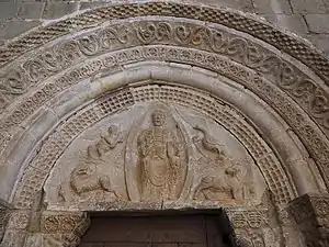 Posee dos portadas: al norte se conservan los restos de un pórtico que cobijaba la portada románica con tímpano en arco apuntado, enmarcado por triple arquivolta y decorado con un relieve del Pantocrátor rodeado por el Tetramorfos, que todavía presenta restos de policromía; al sur se conserva un sencillo vestíbulo elevado que alberga una portada en arco de medio punto.